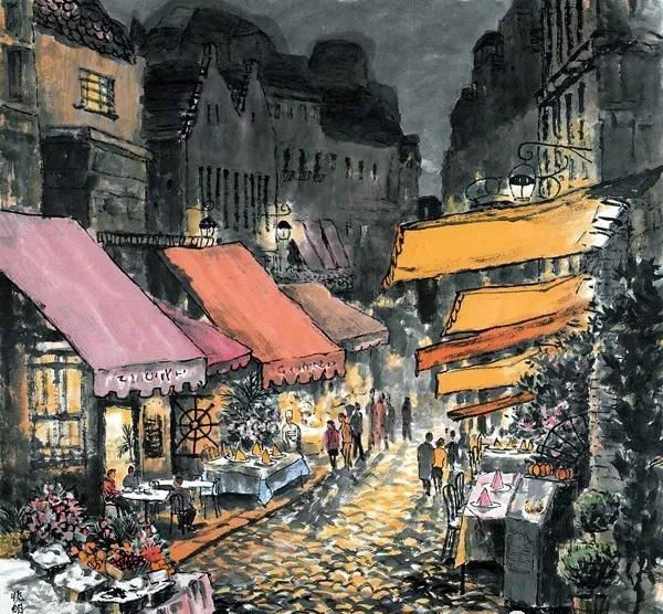 上世纪末到新世纪初,五年来最新近的《旅欧系列》可以看作是裘兆明水墨山水走向成熟的界标。优雅自然,空灵蕴厚,气静骨强,显示出裘兆明山水画的个性风格是十分独特的,一如其人。值得注意的,是她将中国古典画论“得意忘象”之美,转化为“得意取象”、“得意造境”之美。经她这一转化,竟出乎意外,陡然眼前一亮,画面获得沟通赤子之心的现代精神,某些过于趋近古代文人画,某些过于沉溺表层形式美的潮汐起落,或者过于趋同李可染山水原创图式的走向,都为她所不取,因而她的作品与众不同。引人瞩目的《旅欧系列》,像是“对景写生”,并不是“对景写生”。一边一角面对自然生命,人类世界的新鲜美好感觉,无处不在,而艺术格局力求开阔从容,意匠经营严谨完美,造型讲究强调捕摄神韵,颇得李可染“德国写生”之精髓。其构图多取“以大观小法”,紧紧把握纵深线,将形象、层次、气氛、色彩、笔墨等多种元素融为一个整体。她敢于略去乃师山水画作为典型特色的“逆光之美”,为求取色彩元素大幅度驰骋而拓展另一番天地。色彩注重整体调性设计,有灿烂的,有淡雅的,有热烈的,有幽深的;有欢快喧闹的,也有静谧沉寂的;有日光朗照,又有夜巷深深。前人山水画少见和不曾有过的纯蓝色、柠檬黄色,一旦在画面出现,借助四边四角混合色、中间色的衬托,更显出画面境界的空灵玄妙。对建筑的勾画、变异多端,得心应手,并不费力。这里凝聚着女画家幼小时光对父亲亲手绘建筑图样的兴趣和向往吧。